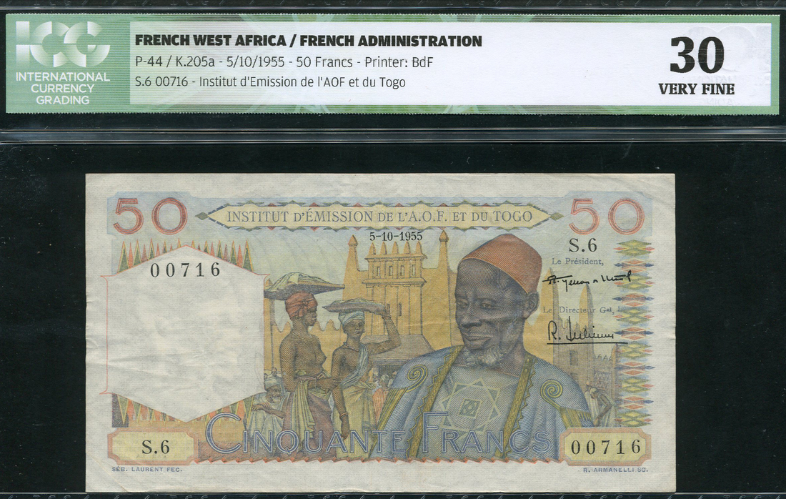 (x) Banque du A.O.F. et du Togo, 50 francs, 5 October 1955, serial number S.6 00716, blue and multicoloured, market scene, du Montcel and Julienne signatures, reverse multicoloured, man with banana plant