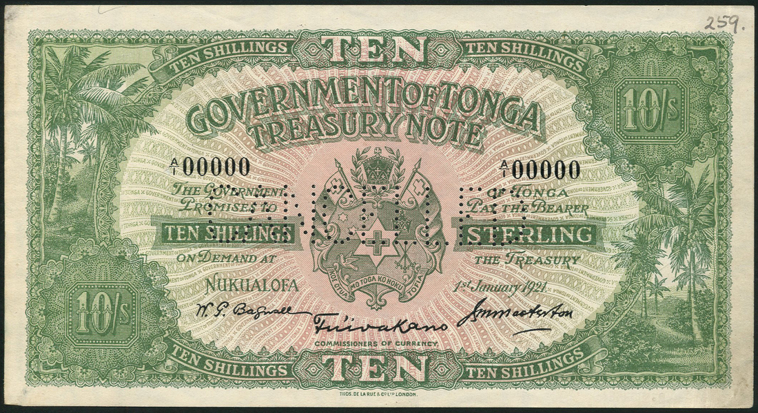 (†) Government of Tonga, specimen 10 shillings, 1 January 1921, serial number A/1 00000, green on pink and green underprint, arms at centre, palm trees at left and right, perforated CANCELLED, very faint purple SPECIMEN handstamp in low margin