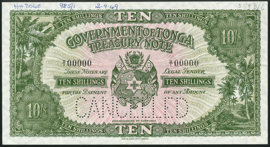 (†) Government of Tonga, a group of specimens, ND (1941-66), comprising, 10 Shillings (2), ND (1939-57), serial number B/1 00000 and ND (1957-66), serial number C/1 00000 both in heavy type; 10 Shillings, ND (1966) serial number C/1 000000 in light type, all green, arms at centre, value at upper right and lower left, palm trees in borders, reverse ornate patterns, all perforated CANCELLED