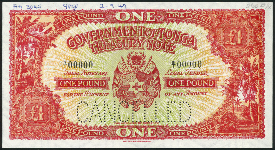 (†) Government of Tonga, a group of specimens, ND (1941-66), comprising, £1 (2), ND (1940-54), both serial number B/1 00000; £1, ND (1954-59) serial number C/1 000000, all in heavy type, all red, arms at centre, value at upper right and lower left, palm trees in borders, reverse ornate patterns, all perforated CANCELLED