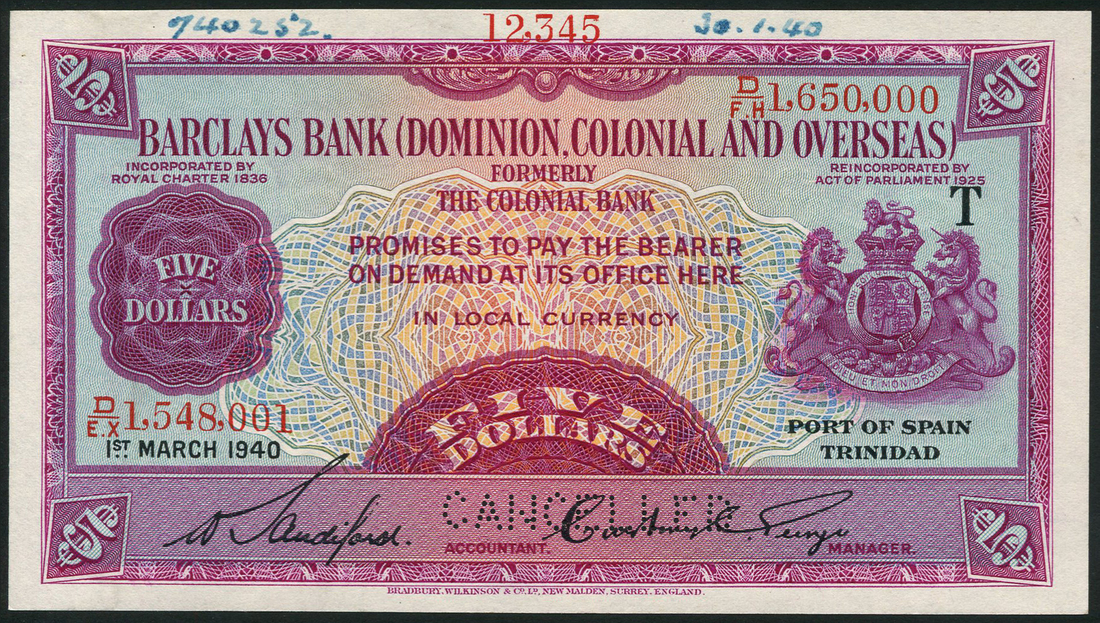 (†) Barclays Bank (Dominion, Colonial and Overseas), Trinidad & Tobago, printer's archival specimen $5, 1 March 1940, serial number run D/EX 1,548,001 to D/FH 1,650,000, Letter 'T for Trinidad & Tobago at upper right, purple on pale blue and multicoloured underprint, value in guilloche at left and in each corner, coat of arms at right, reverse arms at centre, perforated CANCELLED