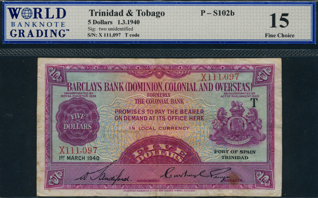 (x) Barclays Bank (Dominion, Colonial and Overseas), Trinidad & Tobago, $5, 1 March 1940, serial number X111,097, Letter 'T for Trinidad & Tobago at upper right, purple on pale blue and multicoloured underprint, value in guilloche at left and in each corner, coat of arms at right, reverse arms at centre, flanked by values
