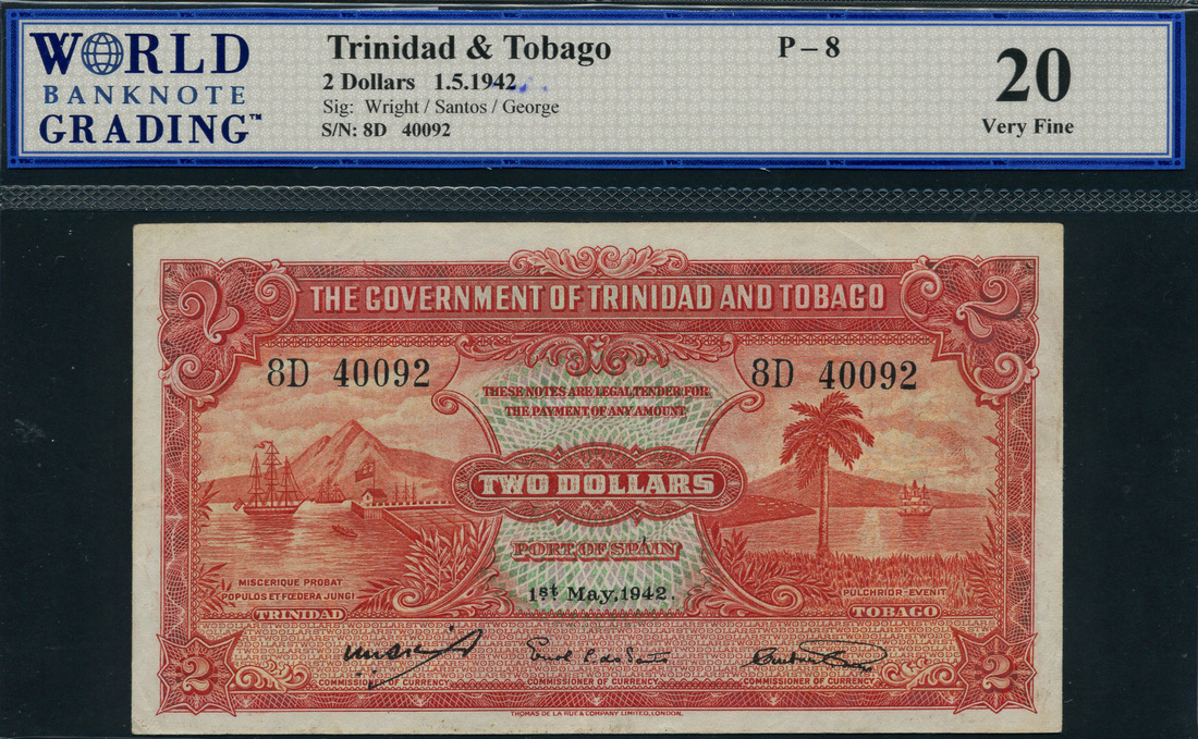 (x) Government of Trinidad and Tobago, $2, 1 May 1942, serial number 8D 40092, red on green, ship, harbour and mountain at left, value at centre, palm tree and coastal scenery at right, reverse red, arms at centre, value at left and right