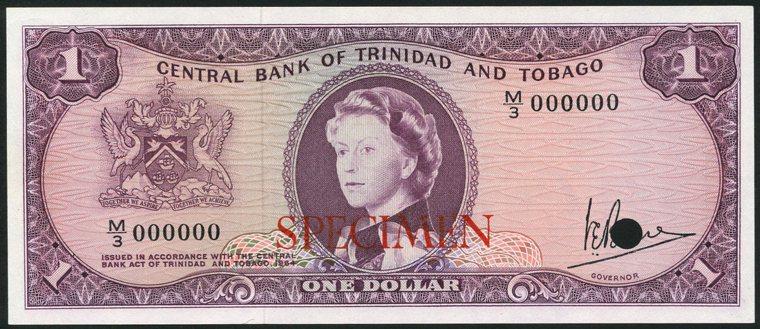 (x) Central Bank of Trinidad and Tobago, colour trial $1, 1964, serial number M/3 000000, purple on multicolour, Annigoni portrait of Queen Elizabeth at centre, arms at left, reverse old Central Bank building, overprinted SPECIMEN horizontally in red on obverse and reverse, one punch hole, Victor E Bruce signature