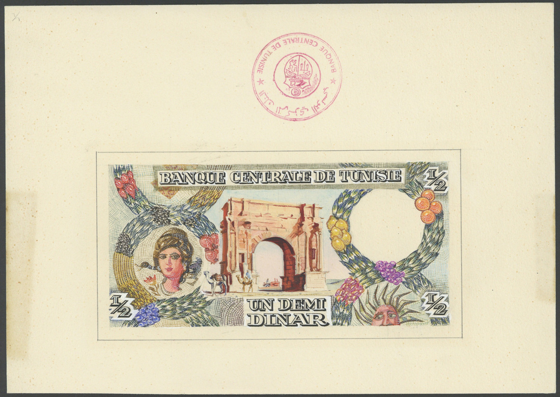 (†) Banque Centrale de Tunisie, a hand painted reverse essay and two archival photographs showing designs for the 1965-1969 series, the essay is a very similar to the issued 5 dinars but is denominated as 1/2 dinar here, and the photographs also show designs similar to those issued, but with different denominations. the essay has a circular red bank handstamp on each side