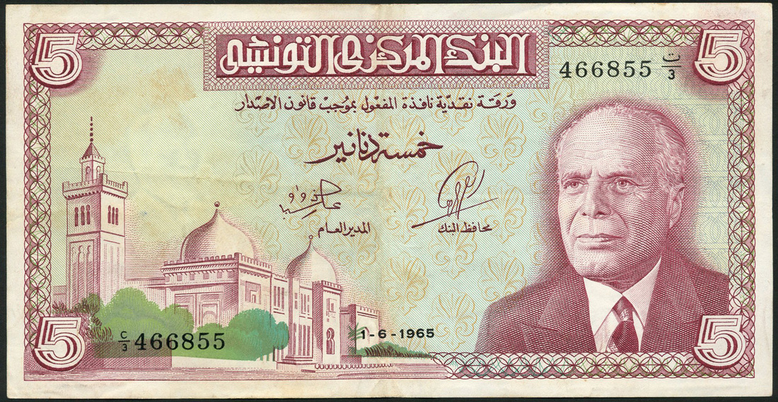Banque Centrale de Tunisie, 5 dinars (2), ND (1958), prefixes C/3, C/4, brown on multicolour, 5 dinars, 20 March 1962, prefixes C/13 and C/23 (2), blue on multicolour, 5 dinars, 1 June 1965, prefixes C/3, C/4, C/11 (2), red on green,