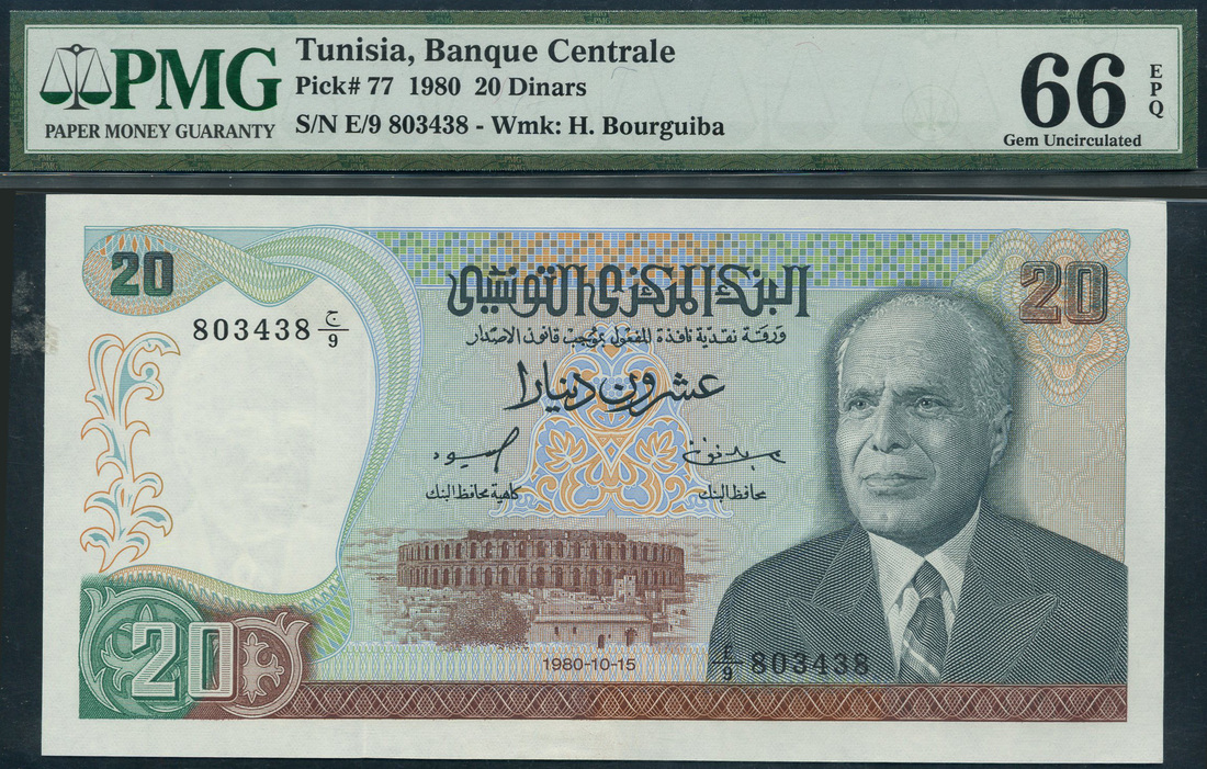 (x) Banque Centrale de Tunisie, 10 dinars, 1974, serial number D/11 098927, purple and pink, President Habib Bourguiba at left, 20 dinars, 1980, serial number E/9 803438, green and brown, Habib Bourguiba at right