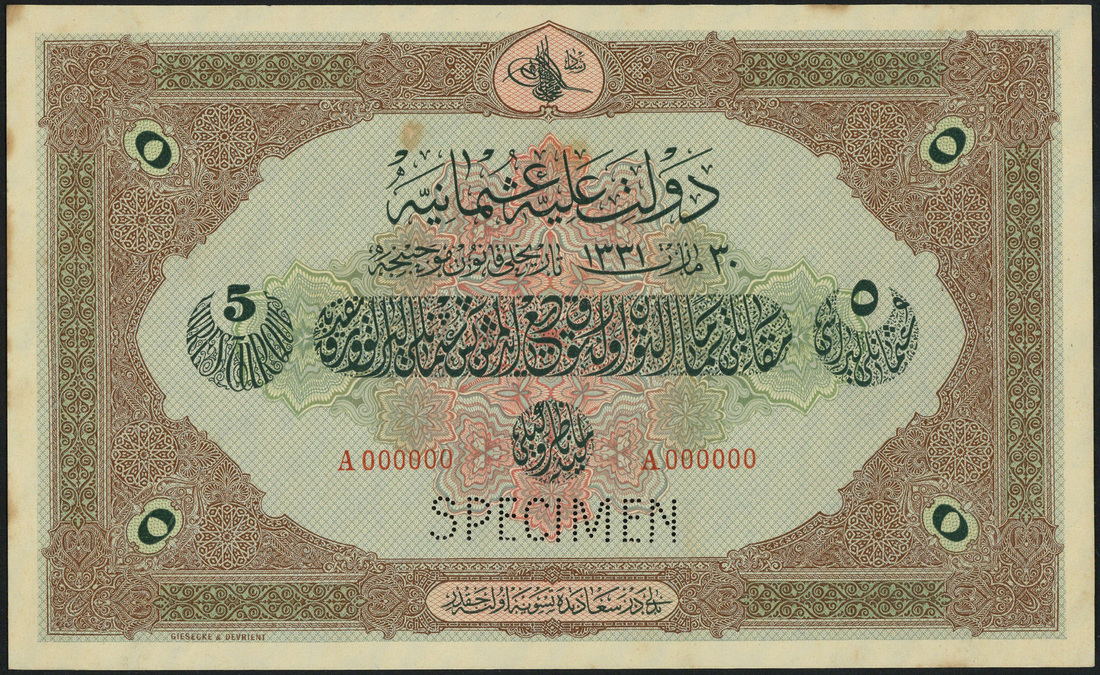 (x) Ottoman Empire, Turkey, specimen 5 livres, AH 1331 (1915), red serial number A 000000, brown, green , pink and pale blue, toughra of Sultan Mehmed Resad V top centre, value at centre and at each corner, no signatures, reverse red and green, text at centre