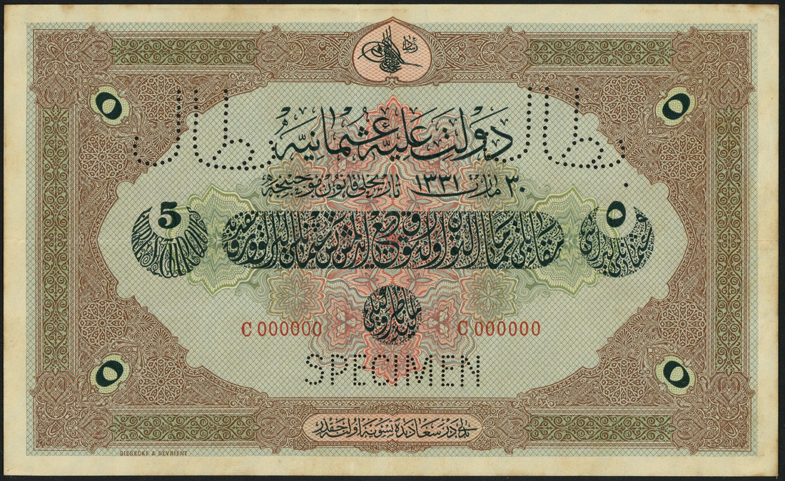 (x) Ottoman Empire, Turkey, specimen 5 livres, AH 1331 (1915), red serial number C 000000, violet, pink and multicoloured, toughra of Sultan Mehmed Resad V top centre, value at centre and at each corner, no signatures, reverse violet and orange-brown, text at centre