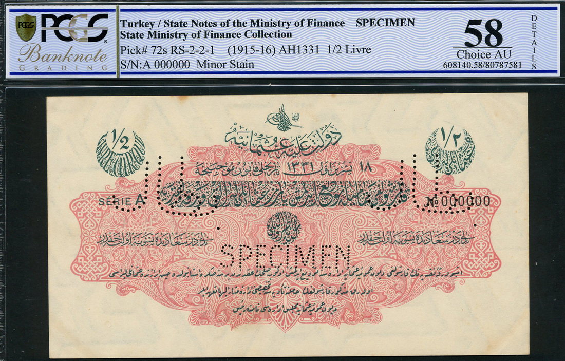 (x) Ottoman Empire, Turkey, specimen 1/2 livre, AH 1331 (1915), black serial number Serie A- 000000, pink, black and white, toughra of Sultan Mehmed Resad V top centre, value at centre and at each corner, no signatures, reverse blank