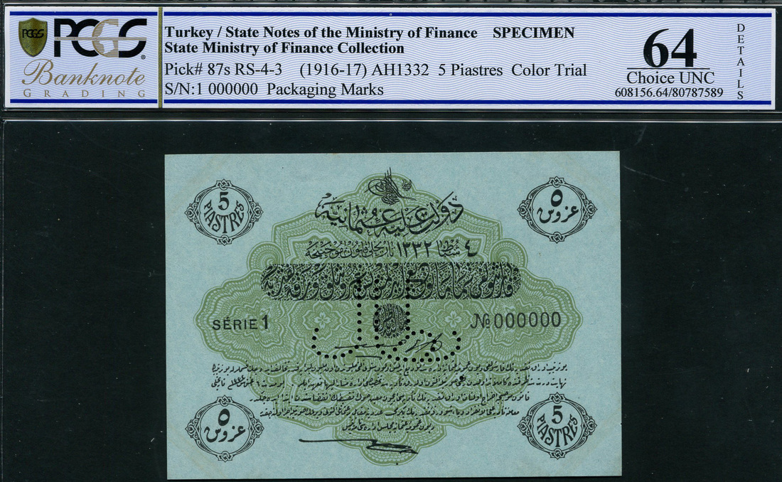 (x) Ottoman Empire, Turkey, specimen 5 piastres, AH 1332 (1917), black serial number SERIE 1- 000000, green on pale blue underprint, toughra of Sultan Mehmed Resad V top centre, value at each corner in oval cartouche, Cavid and Cahid signatures, reverse blank