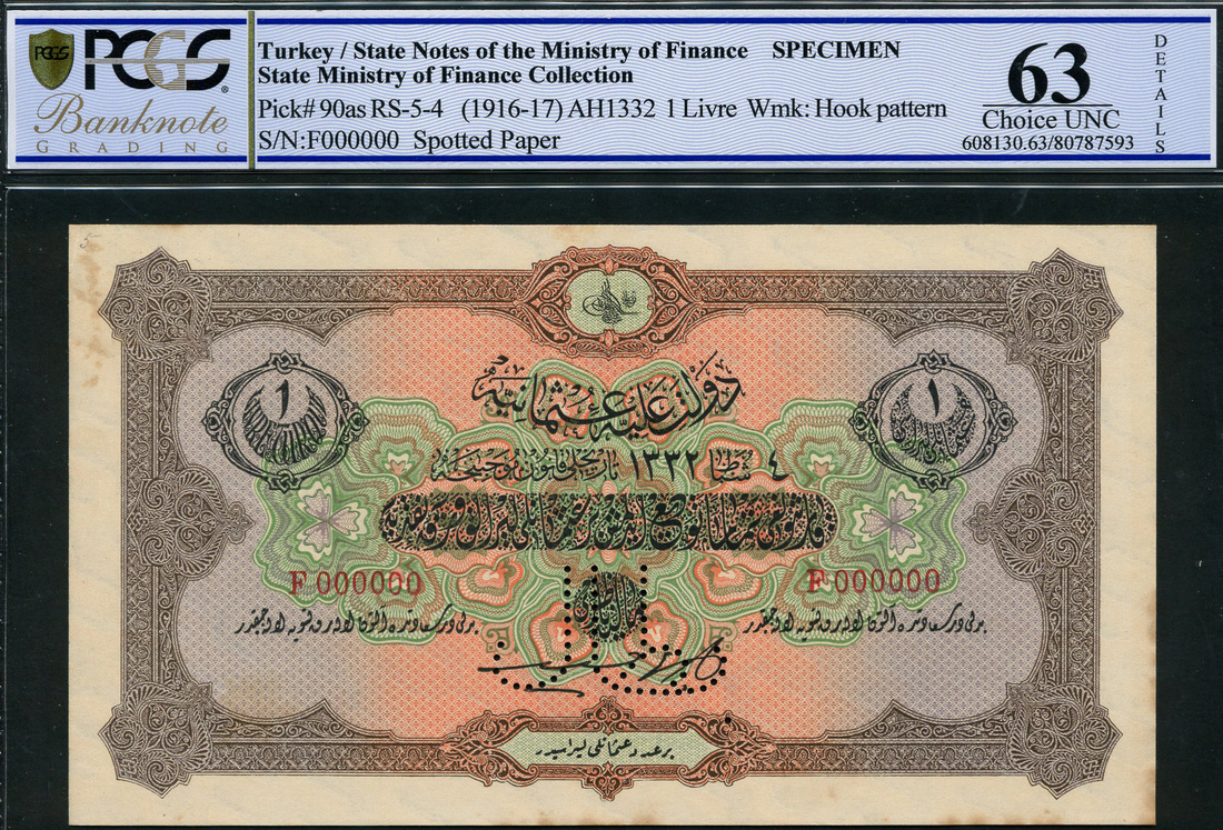 (x) Ottoman Empire, Turkey, specimen 1 livre, AH 1332 (1917), red serial number F 000000, purple, pink and multicoloured, toughra of Sultan Mehmed Resad V top centre, value top left and right, Cavid signature, reverse orange-brown and tan