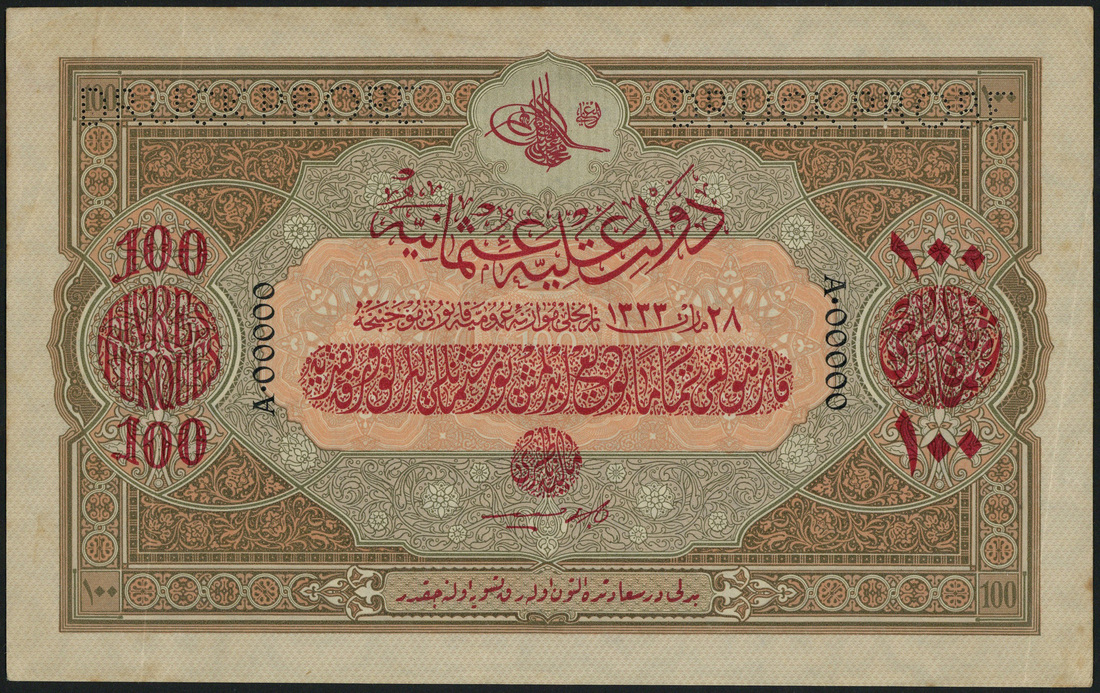 (x) Ottoman Empire, Turkey, specimen 100 livres, AH 1332 (1917), black serial number A 000000, orange-brown, grey and mauve, toughra of Sultan Mehmed Resad V top centre, value at left and right, Cavid signature low centre, reverse brown-mauve, text at centre, value at low left and low right