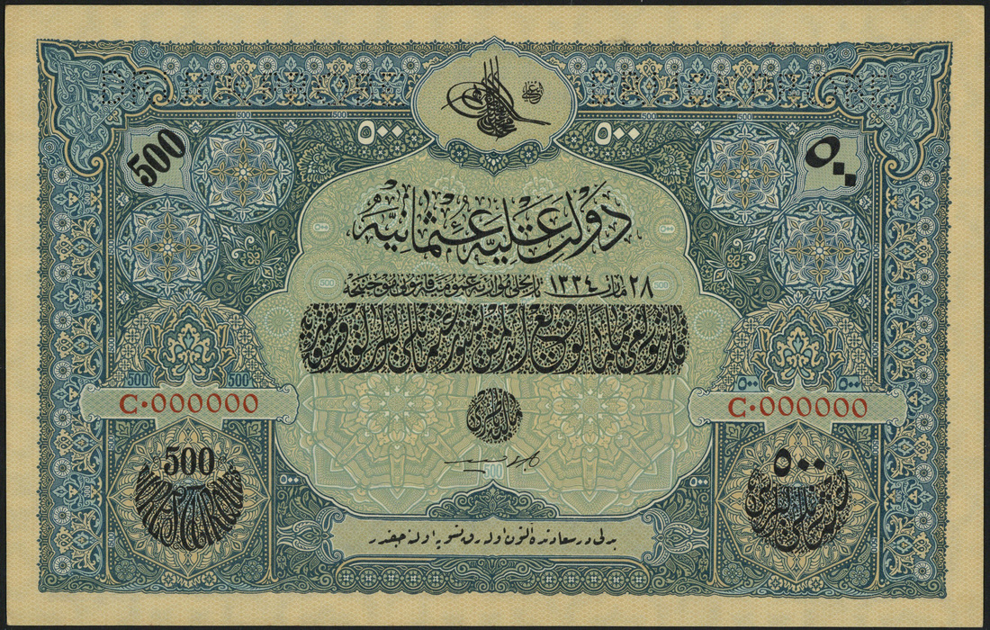 (x) Ottoman Empire, Turkey, specimen 500 livres, AH 1334 (1918), red serial number C 000000, blue and pale orange, toughra of Sultan Mehmed Resad V top centre, value at each corner, Cavid signature low centre, reverse mauve, text at centre, value at left and right