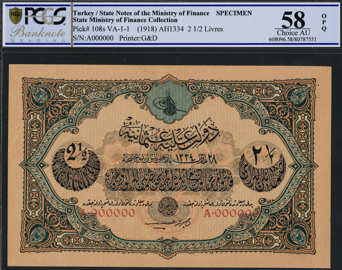 (x) Ottoman Empire, Turkey, specimen 2 1/2 livres, AH 1334 (1918), red serial number A 000000, orange-brown, pink and pale blue, toughra of Sultan Mehmed Vahdeddin VI top centre, value at left and right, Cavid signature low centre, reverse purple and green, text at centre, value at top left and top right