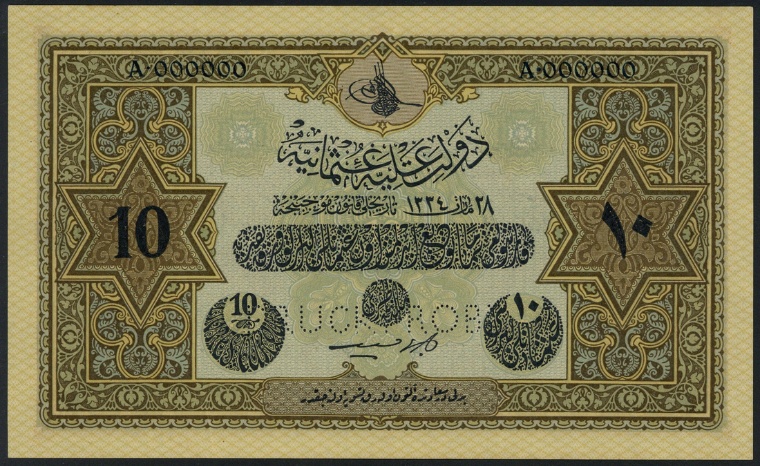 (x) Ottoman Empire, Turkey, specimen 10 livres, AH 1334 (1918), blue serial number A 000000, orange-brown, blue and pale orange, toughra of Sultan Mehmed Vahdeddin VI top centre, value at left and right, Cavid signature low centre, reverse purple and pale blue-green, text at centre, value at low left and low right