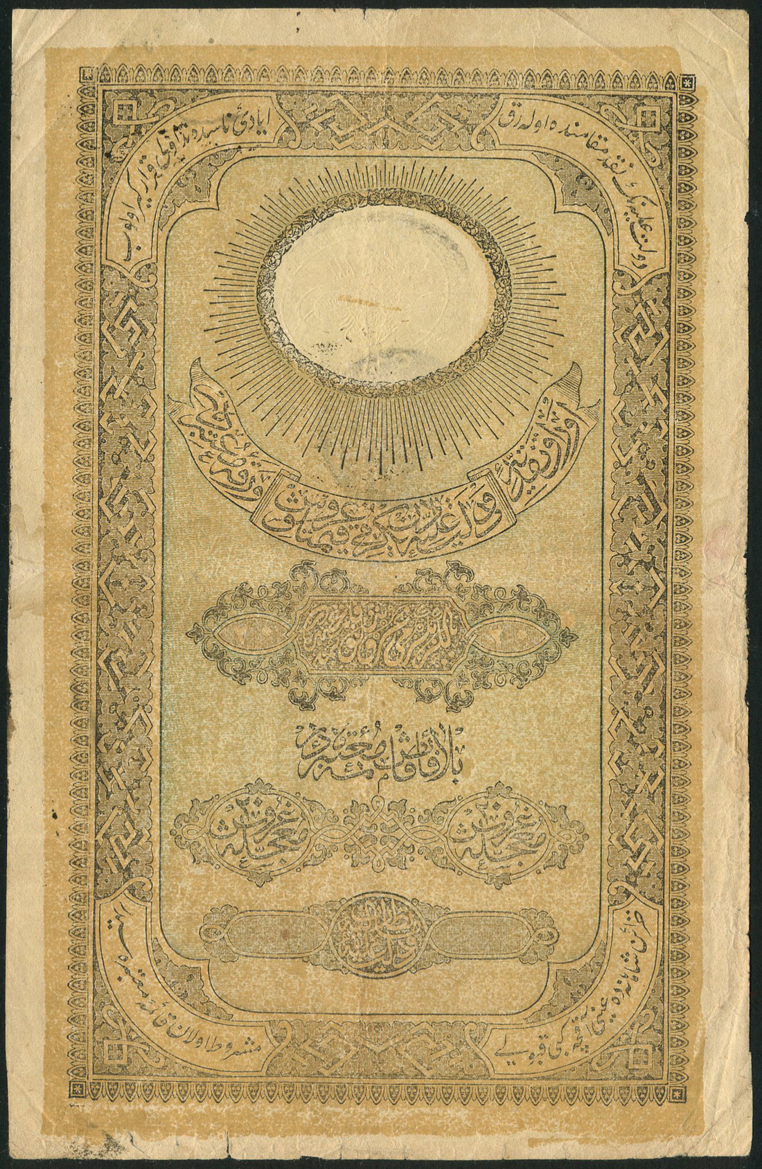 (x) Ottoman Empire, Turkey, 20 kurush, ND (1855-57), black on light tan underprint, vertical format, text within rectangular frame, one seal on reverse