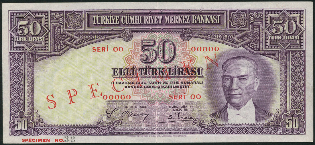 (†) Central Bank of Turkey, specimen 50 Lirasi, Law of 1930 (1937-9), Seri 00, serial number 00000, purple on pale green underprint, portrait of Mustafa Kemal Ataturk at lower right, reverse flock of sheep, trees and mountains, overprinted with hollow SPECIMEN diagonally in red on obverse only, SPECIMEN No.32 in lower left margin