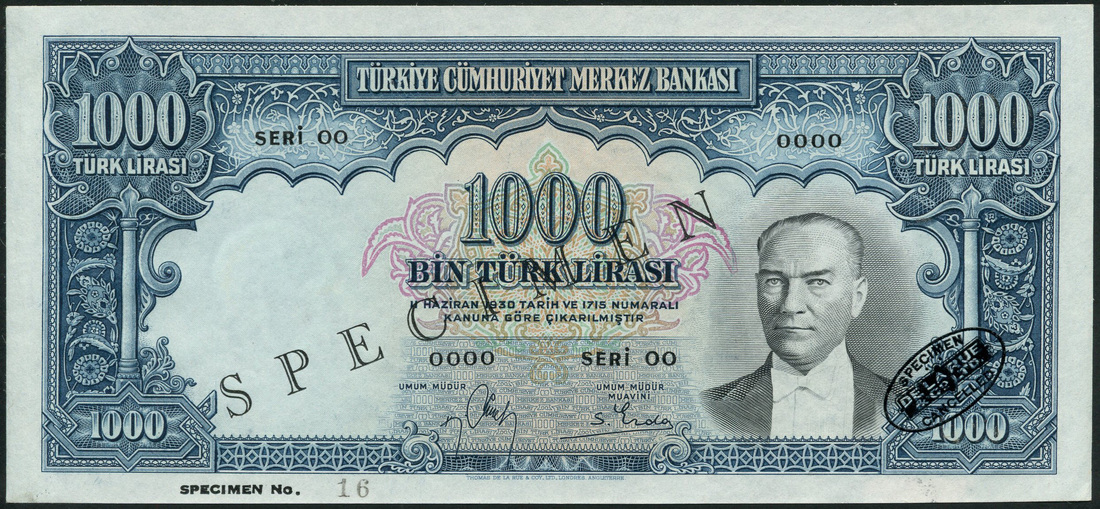 (†) Central Bank of Turkey, specimen 1000 Lirasi, Law of 1930 (1942-4), Seri 00, serial number 0000, blue and black, portrait of Mustafa Kemal Ataturk at lower right, reverse Security Monument in Ankara's Guvenpark, overprinted with hollow SPECIMEN diagonally in black and one De La Rue specimen oval at lower right on obverse only, SPECIMEN No.16 in lower left margin