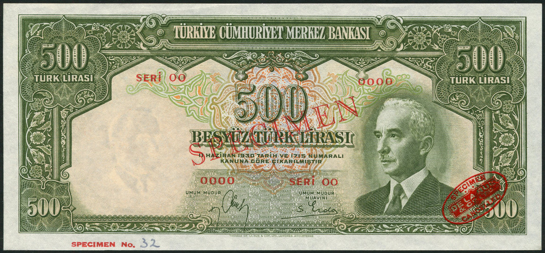 (†) Central Bank of Turkey, specimen 500 Lirasi, Law of 1930 (1942-4), Seri 00, serial number 0000, green, portrait of President Ismet Inonu at lower right, reverse Roumeli Hissar castle on the Bosporous, overprinted with hollow SPECIMEN diagonally in red and one De La Rue specimen oval at lower right on obverse only, SPECIMEN No.32 in lower left margin