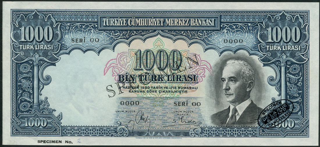 (†) Central Bank of Turkey, specimen 1000 Lirasi, Law of 1930 (1942-4), Seri 00, serial number 0000, blue and black, portrait of President Ismet Inonu at lower right, reverse Security Monument in Ankara's Guvenpark, overprinted with hollow SPECIMEN diagonally in black and one De La Rue specimen oval at lower right on obverse only, SPECIMEN No.2 in lower left margin