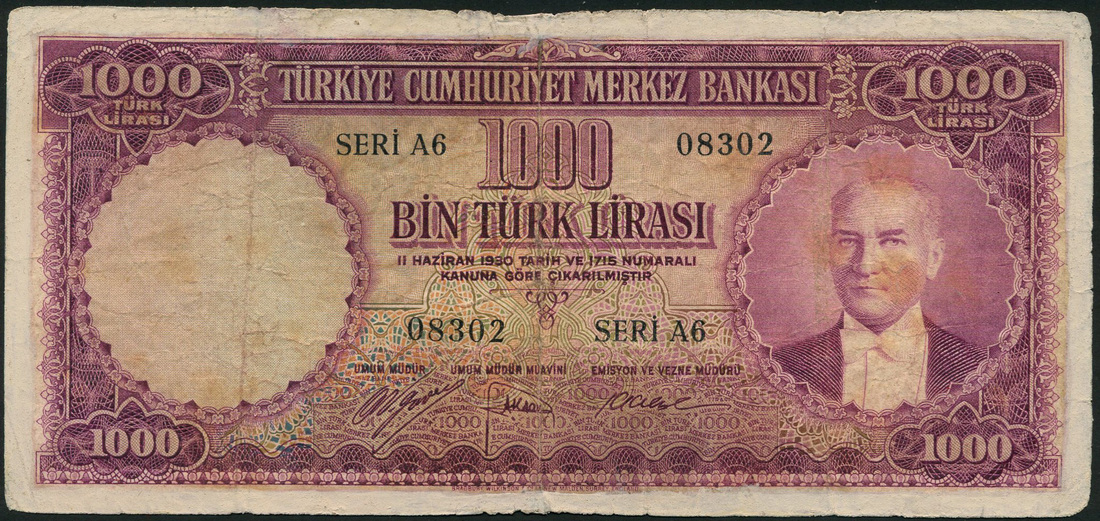 Central Bank of Turkey, 500 lira, 1968, serial number Y 04 039426, lilac on multicolour, 1000 lira, 1953, serial number A6 08302, purple on multicolour, Mustafa Kemal Atatürk at right