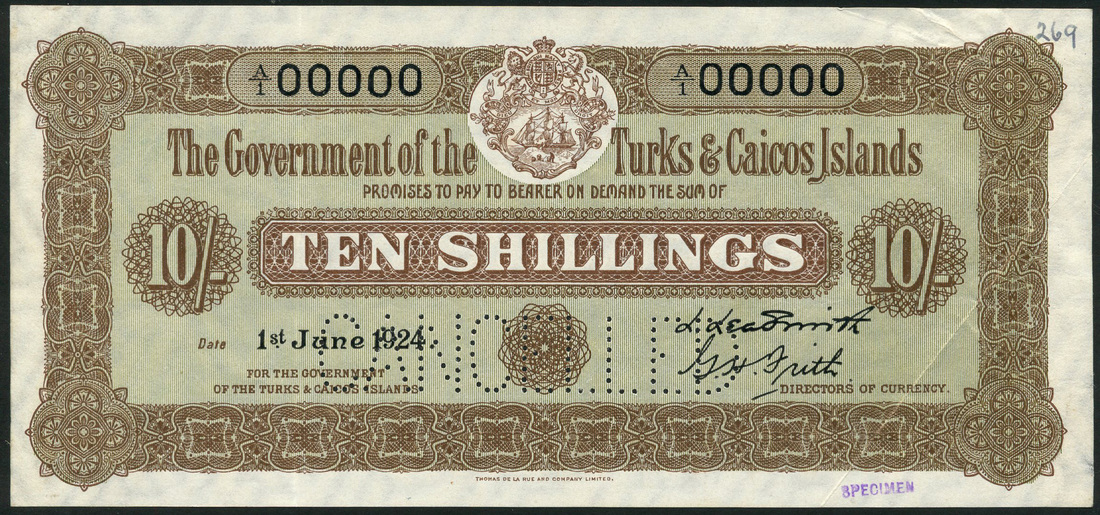 (†) Government of the Turks and Caicos Islands, 10 shillings, 1 June 1924, serial number A/100000, uniface, brown and pale green, arms top centre, value in brown tablet at centre and at left and right, ornate border