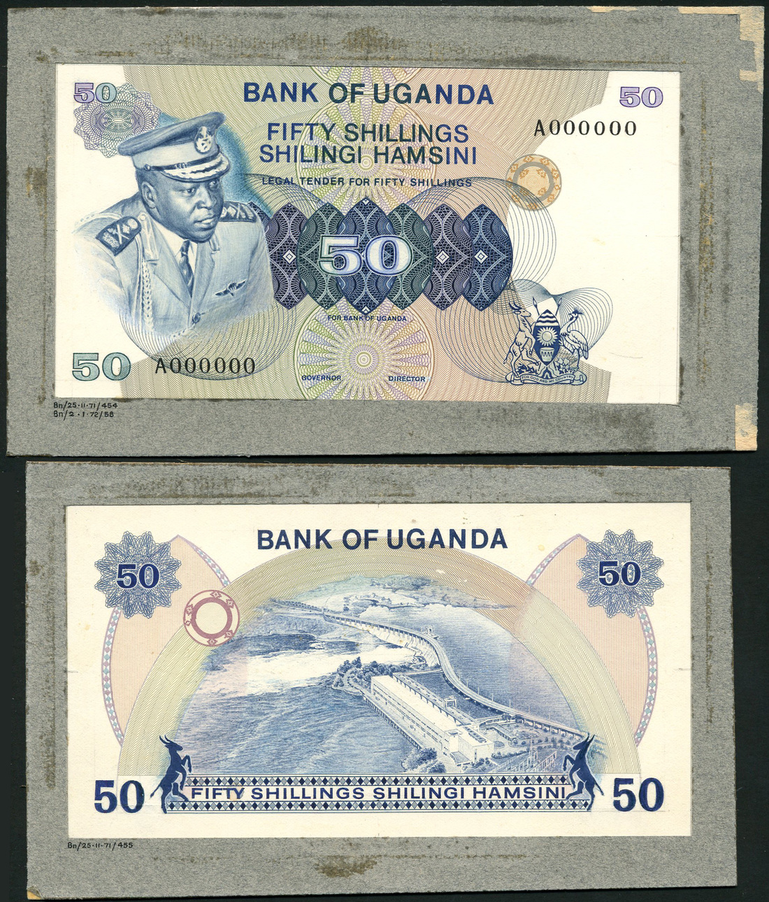 (†) Bank of Uganda, obverse and reverse composite essay for 50 shillings, ND (1971-2), blue and multicolour, hand painted portrait of Idi Amin at left, arms at low right, value at centre, reverse, dam and power station at centre