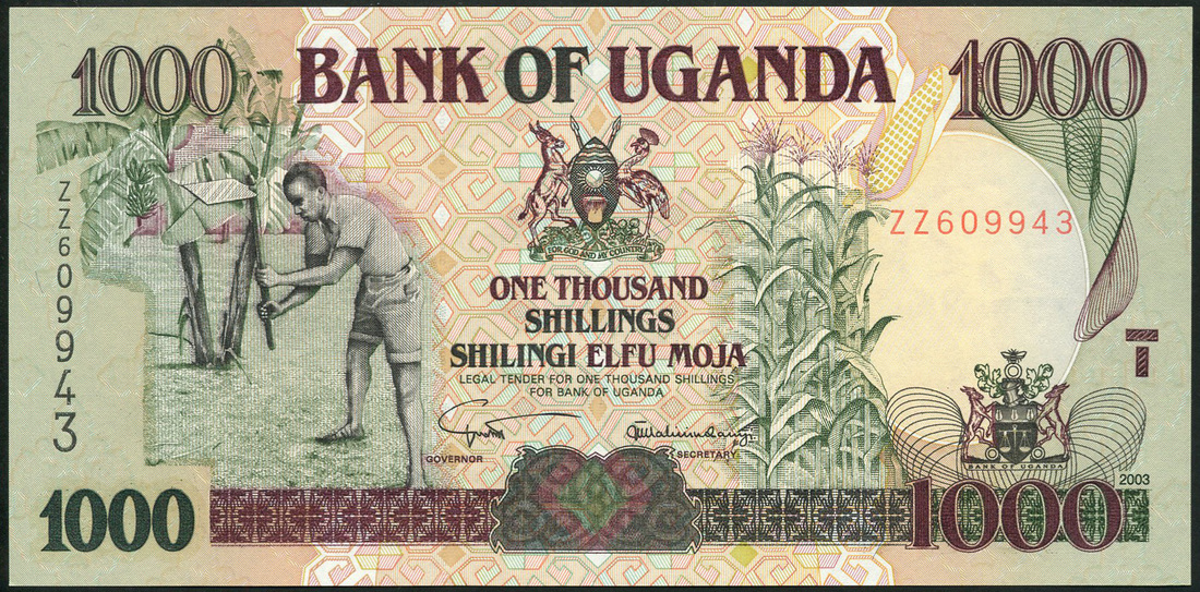 (x) Bank of Uganda, a group of replacement notes comprising 5/-, 1979, serial number Z/1 447892, blue, 50/-, 1985, serial number X/1 009632, brown, 100/-, 1973, serial number W/1 337943, 100/-, 1982, serial number W/1 753864, 1000/-, 2000, serial number ZZ609943