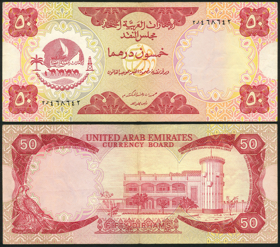 (x) United Arab Emirates Currency Board, 50 dirhams, 1973, red and multicoloured, arms at left