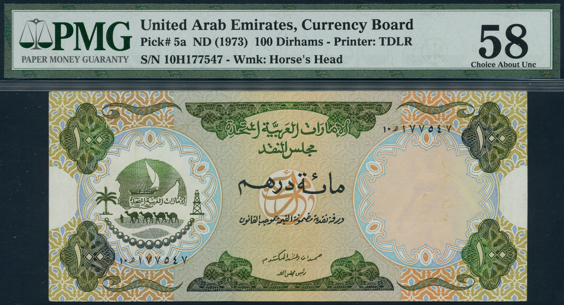 (x) United Arab Emirates Currency Board, 100 dirhams, ND (1973), serial number 10H177547, green on multicolour underprint, palm tree, man leading four camels, sama’a dhow with sail, oil derrick, outline of UAE coast, string of pearls at left, value in ornate tablets in each corner, reverse, city of Khorfakkan in the Emirate of Fujairah