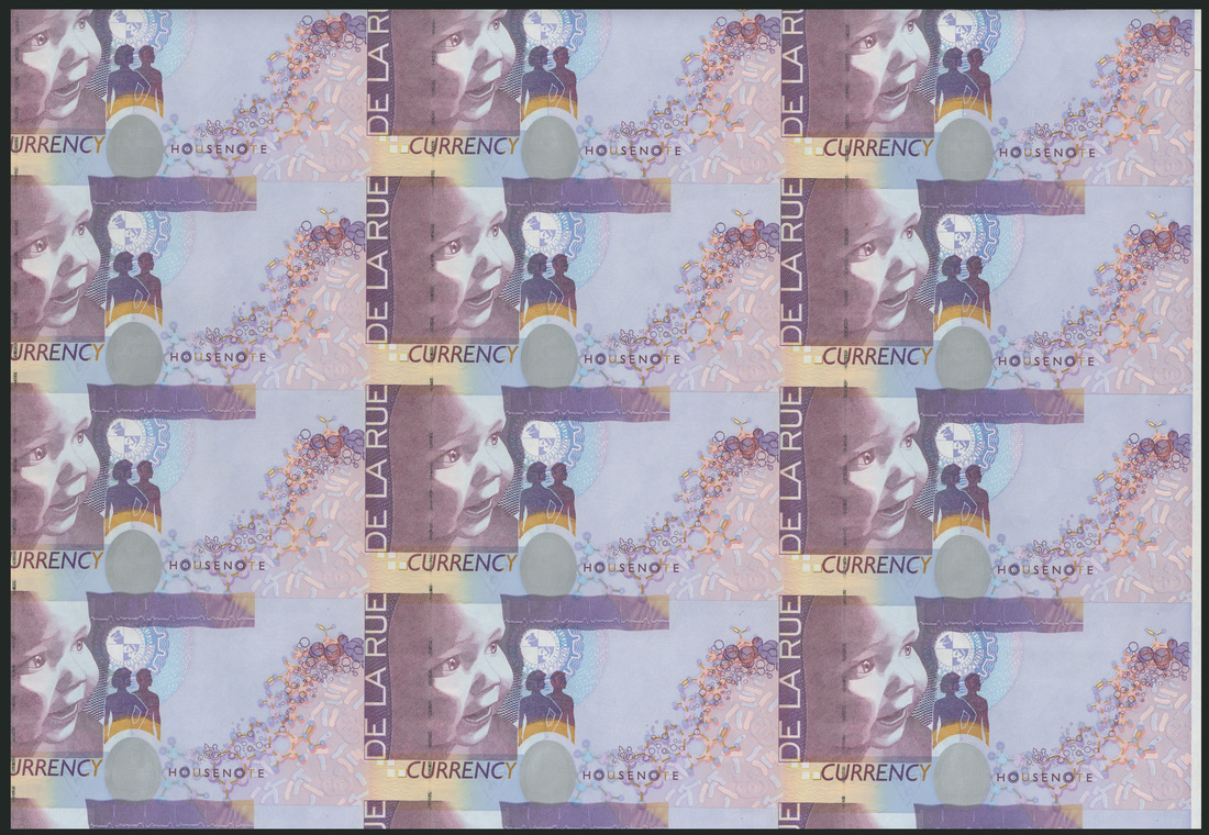 De la Rue, a sheet comprising 21 uniface promotional housenotes, purple and multicoloured, baby at left, man and woman in field, conjoined male and female symbols on a silver foil medallion low centre, reverse blank