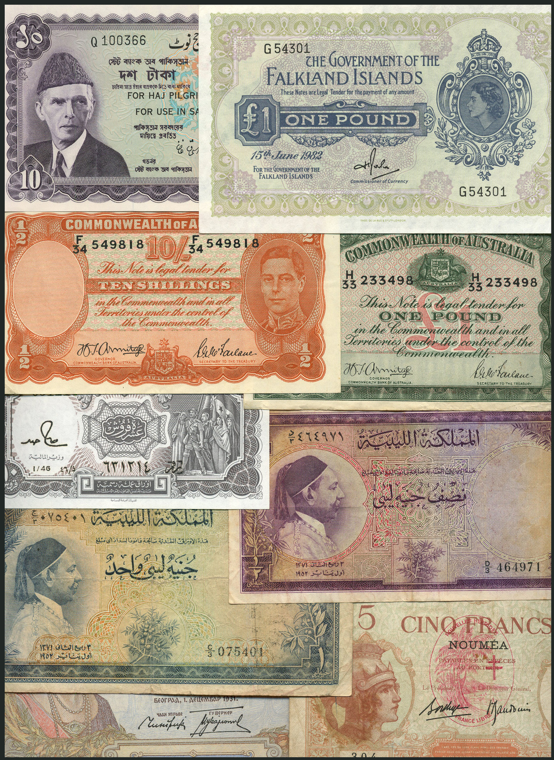 Pakistan, Haj Pilgrim Notes, 10 rupees (2), ND (1972), consecutive serial numbers Q 100366/7, purple on multicolour underprint, Mohammed Ali Jinnah at left, value in ornate tablets at each corner, flowers in background at centre, reverse, Shalimar Gardens in Lahore, together with q large mixed group Including the following, Australia, 10 shillings, (Pick 25b), £1 (2), (Pick 26b), Reserve Bank of New Zealand, $1, (Pick 169), Bermuda Monetary Authority, $2 (Pick 34), Cayman Islands Currency Board, $1 (2), (Pick 1, 5), East Caribbean Central Bank, $5, (Pick 31), $10, (Pick 27), Egypt, 25 piastres, (Pick 10d), 10 piastres (2), (Pick 181), Falkland Islands, £1, (Pick 8e), India, 1 rupee, (Pick R1), Libya, ½ pound, (Pick 15), £1, (Pick 16), Noumea, 5 francs (2), (Pick 36), Malaya and British Borneo, $1, (Pick 8), Malta, £1, (Pick 31), Netherlands Antilles, 2 1/2 gulden, (Pick 21), Norges Bank, 10 kroner, (Pick 31), Portugal, 20 escudos (3), (Pick 167, 173), Singapore (5), (Pick 1, 9), Yugoslavia, 1000 dinara, (Pick 29), Germany (7), Notgeld (5), Bangladesh (1), Austria, 100 schilling, (Pick 118), Bohemia& Moravia, 100 korun, (Pick 6), Netherlands, 1 gulden, Scotland, £1 (5), (Pick 111a, 202, 204c, 329a, 336a), Treasury Series, Bradbury, £1, Pakistan, 100 rupees, (Pick 18a)