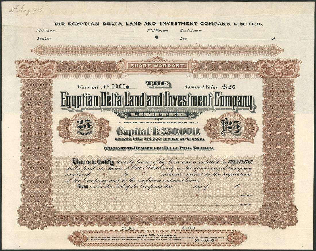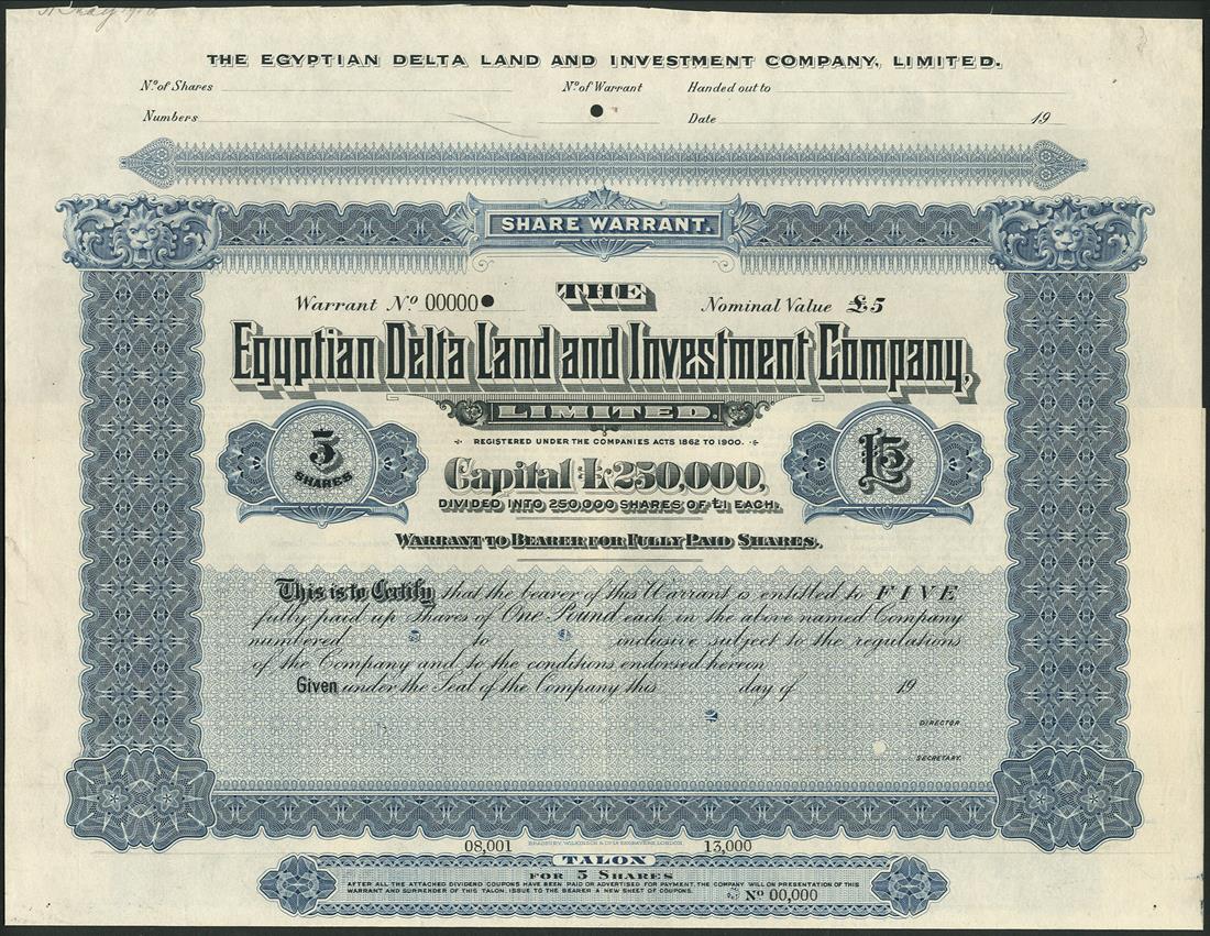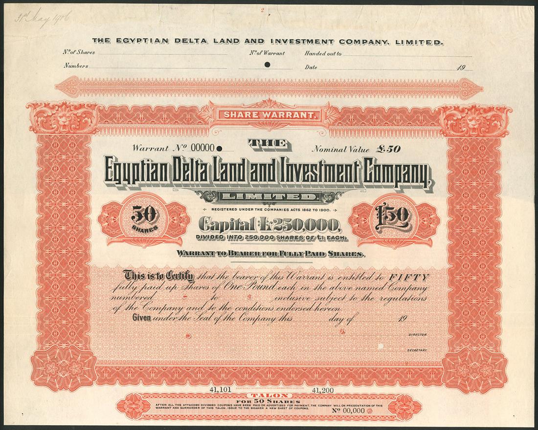 Egyptian Delta Land and Investment Co. Ltd., a group of three specimen bearer warrants for 5, 25 and 50 shares of £1 each, from the Bradbury, Wilkinson & Co. archive, 19- (annotation for 1906), ornate border, blue, brown and red respectively, numbered 00000, with coupons, extremely fine. (3) [R10]