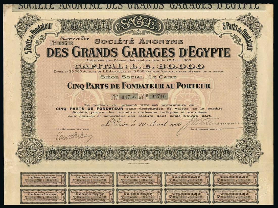 S.A. des Grands Garages d'Egypte, a group of 20 certificates for 5 founders shares, Cairo 1906, ornate border, attractive underprint of early motor car, black, pink underprint, with coupons, mostly extremely fine and better. (20)