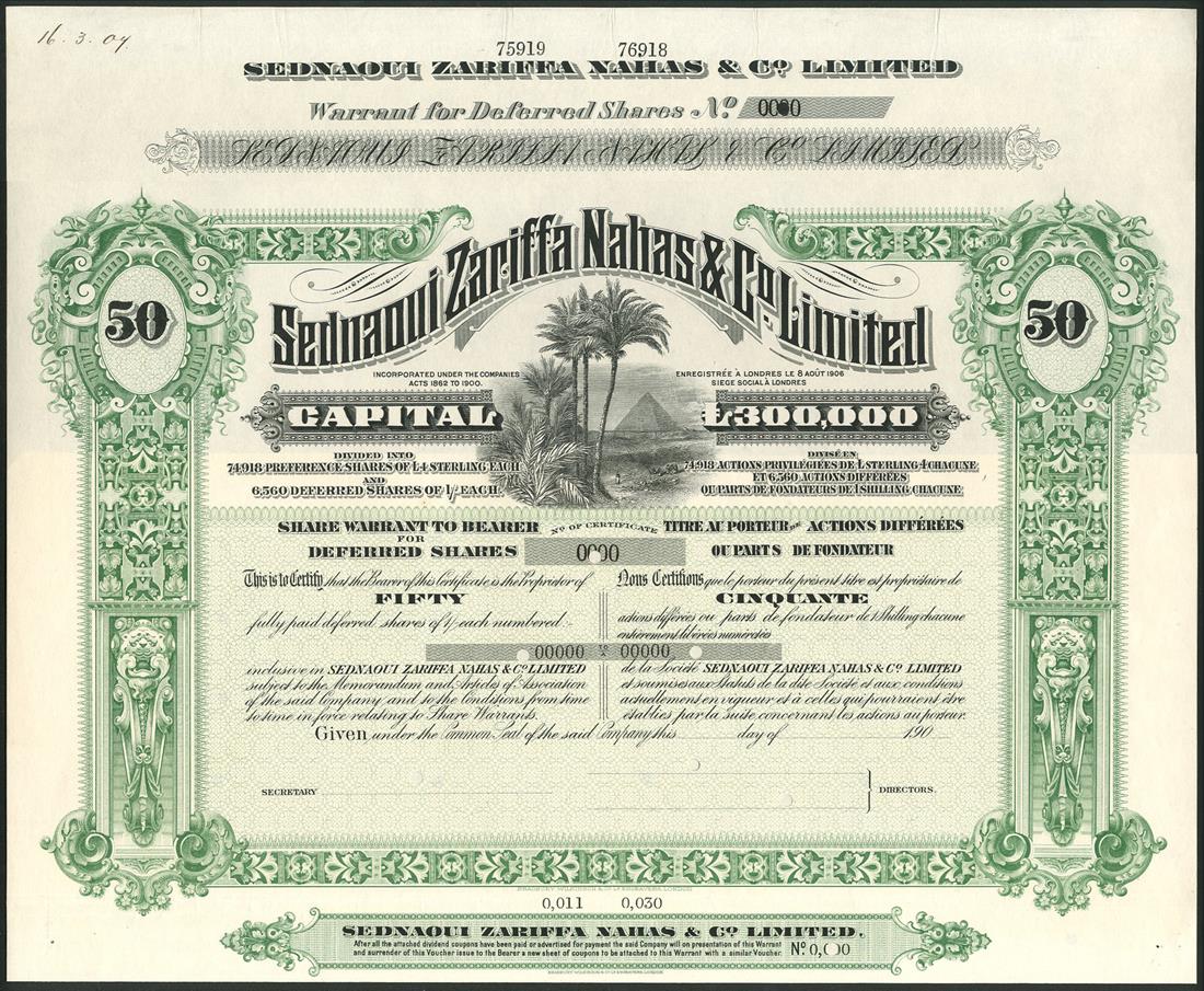 Sednaoui Zariffa Nahas & Co. Ltd., a group of 3 specimen certificates from the Bradbury, Wilkinson & Co. archive, bearer warrants for 5, 10 and 50 deferred shares of 1/-, 190[-], vignette of palm trees and pyramid, text in English and French, brown and black and green and black respectively, with coupons, all have printers annotations, good very fine to extremely fine. (3)