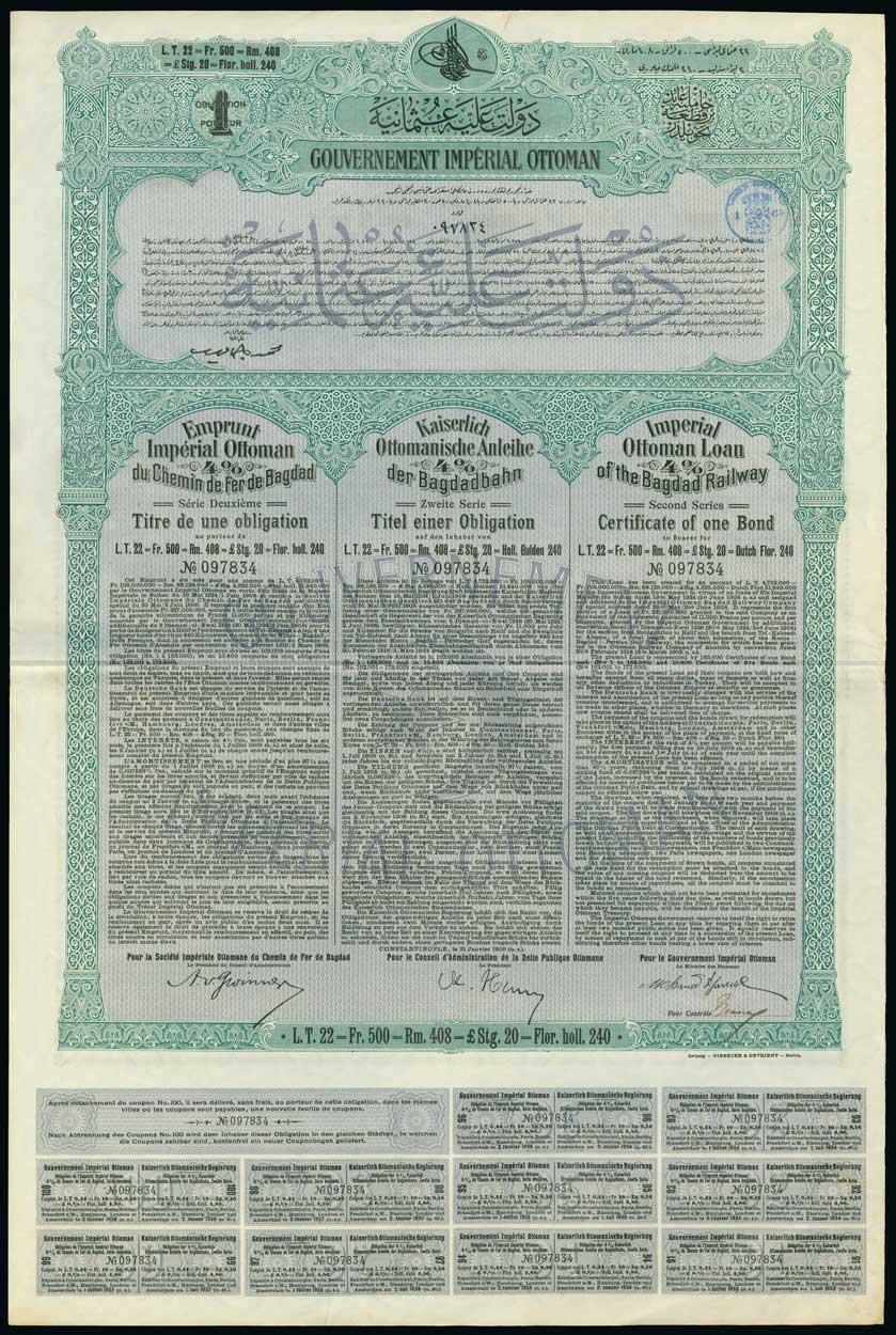 Imperial Ottoman 4% Loan of the Baghdad Railway, Second series, 1909, £20, no.097834, very large format piece with ornate border, text in Arabic, French, German and English, green and black, grey underprint, with coupons, good very fine.