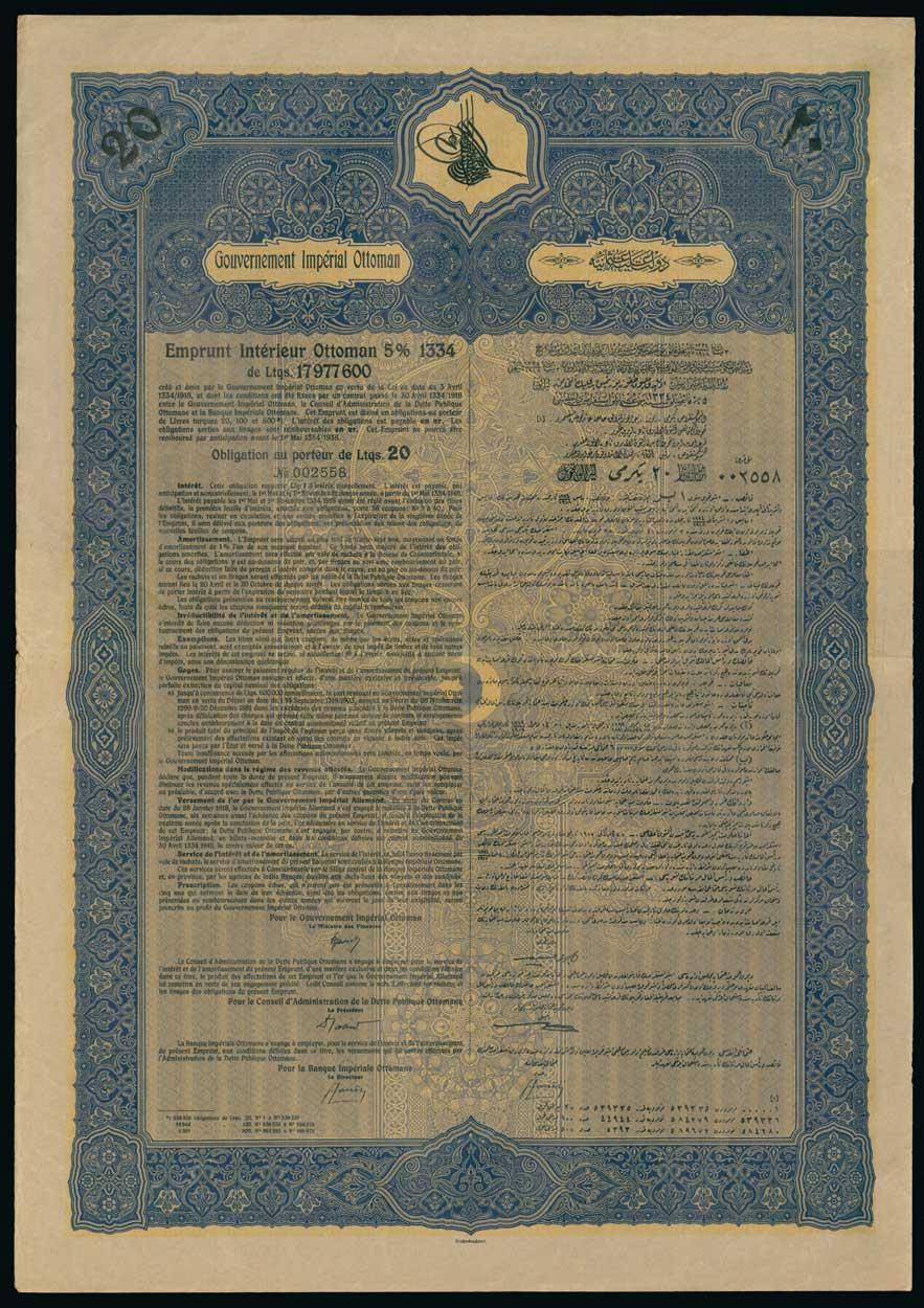 Imperial Ottoman 5% Loan of 1334 (1918), £20, no. 002558, large format piece with ornate border, text in French and Arabic, blue and black, yellow underprint, with coupons, good very fine.