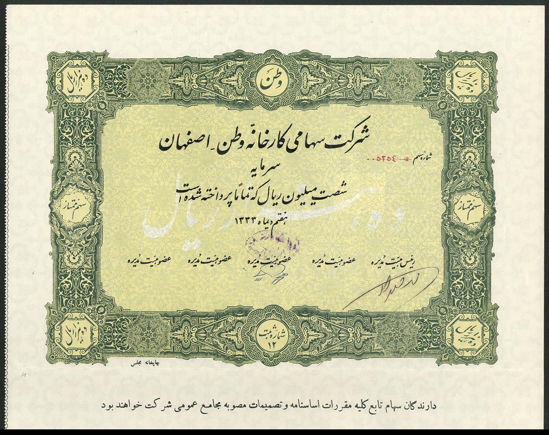 Vatan Factory Company (Esfahan) Ltd., a group of 9 certificates for 10,000 rials preferred shares, 7th of Dey 1333 (December 28, 1954), capital of the company 60,000,000 rials, ornate border, green and yellow, text all in Arabic (farsi), with coupons, revenue stamp on reverse, extremely fine and rare. (9).