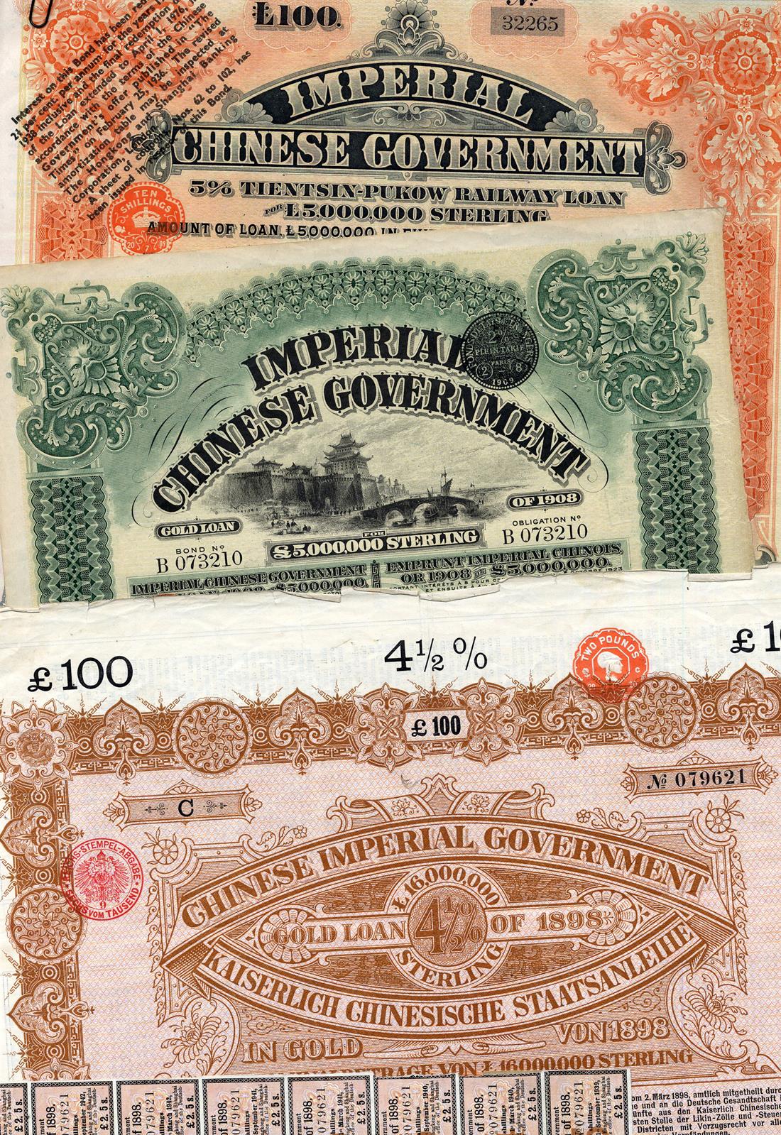 A Collection of Chinese bonds (12) comprising 1898, £100, German issue; 1908 Tientsin Pukow Railway, £100, English issue; 1903 'Emprunt Chinois', 500 francs, dated 1905; 1908 5% Gold Loan, £20, French issue; 1911, Hukuang Railways, £100, American Banks; 1912, 5% Gold Loan, £20; 1913, 5% Reorganisation Loan, £20 and £100, both HSBC issue; 1914 5% Industrial Loan, 500 francs; 1919 'Vickers' Loan, £100; 1925 Lung Tsing U Hai Railway, 500 francs, and 1925 'Boxer' Loan, $50, all with coupons, generally very fine or better. (12)