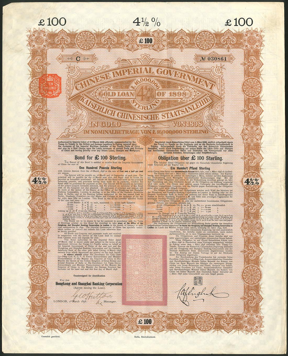 1898 4½% Gold Loan, a group of 3 bonds for £100, issued by the Hongkong & Shanghai Banking Company, large format, ornate border, brown and black, red 'chop' bottom centre, with coupons, good very fine and unusual to find in this nice condition. (3)