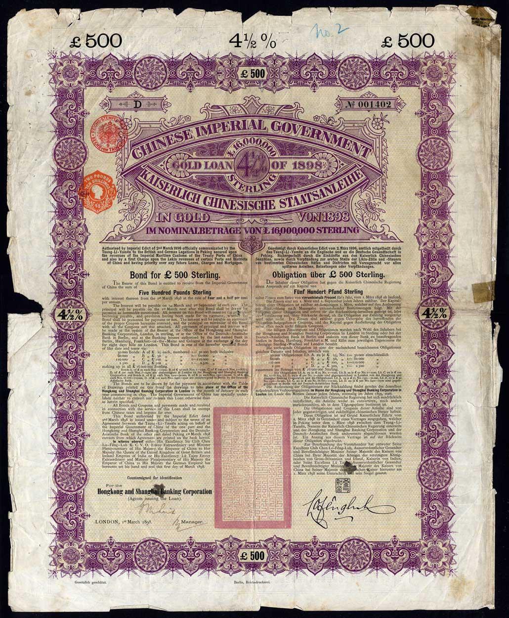 1898, 4½% Gold Loan, £500 bond, no.001402, issued by the Hongkong and Shanghai Banking Corporation, large format, ornate border, mauve and black, red chop in centre, with coupons, edge tears with small piece missing from left edge not into the design, fine and scarce.