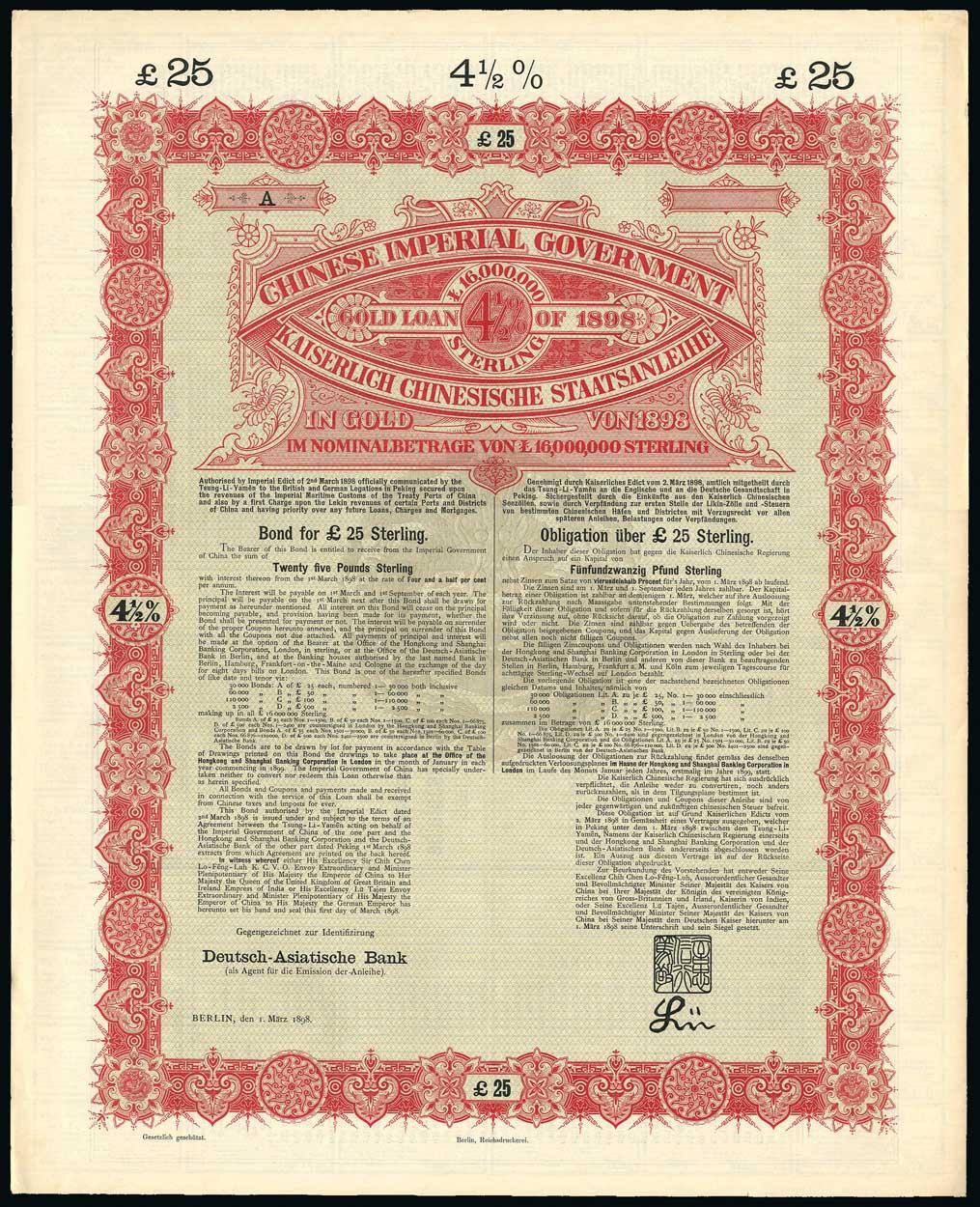 1898 4½% Gold Loan, unissued £25 bond from the reserve stock, issued by Deutsch-Asiatische Bank, large format, ornate border, red and black, not numbered, no red chop in centre, with all coupons, extremely fine and scarce