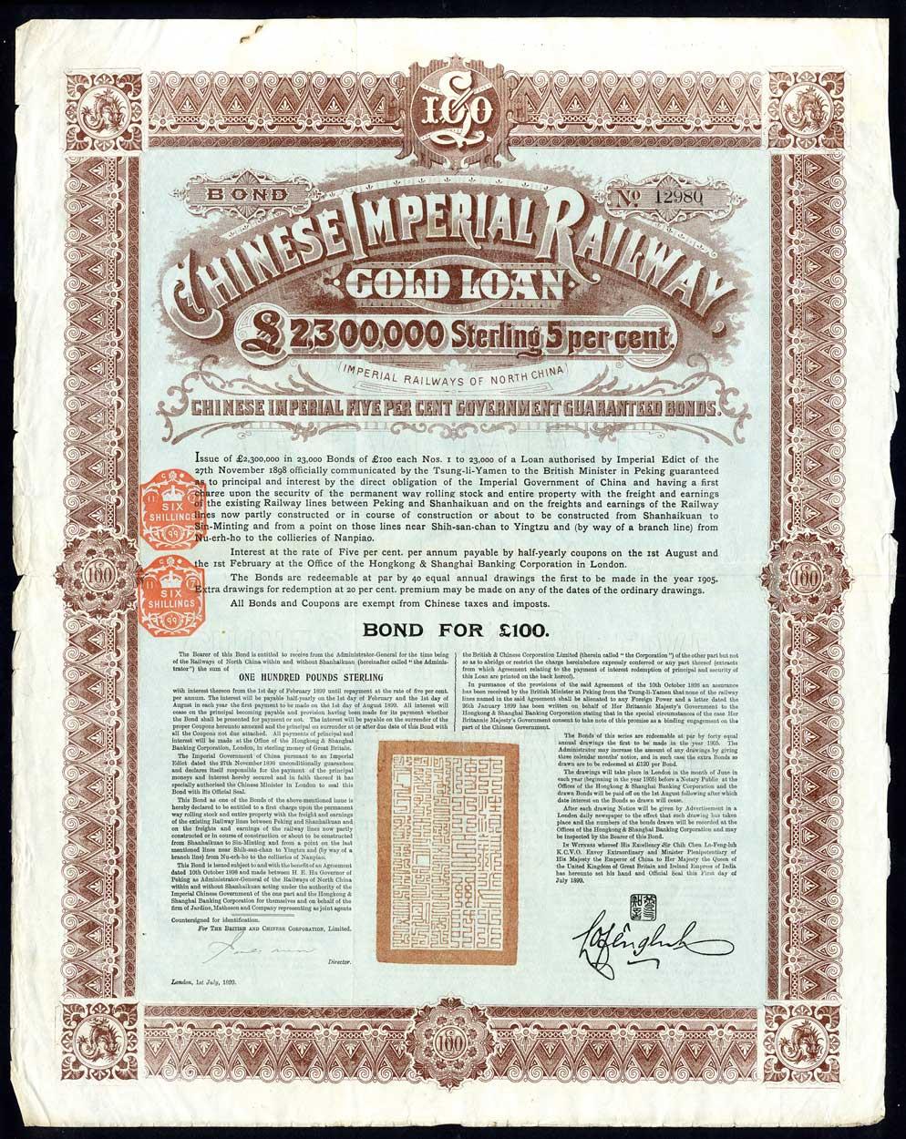 1899, Chinese Imperial Railway, Railways of North China, 5% Gold Loan, £100 bond, no. 12980, very large format piece with ornate border, brown with blue underprint, with coupons (K.90); together with 1898 41/2% Gold Loan, £25 bond, German issue and Banque Industrielle de Chine, 500 franc share, 1920, generally very fine, the last better. (3)
