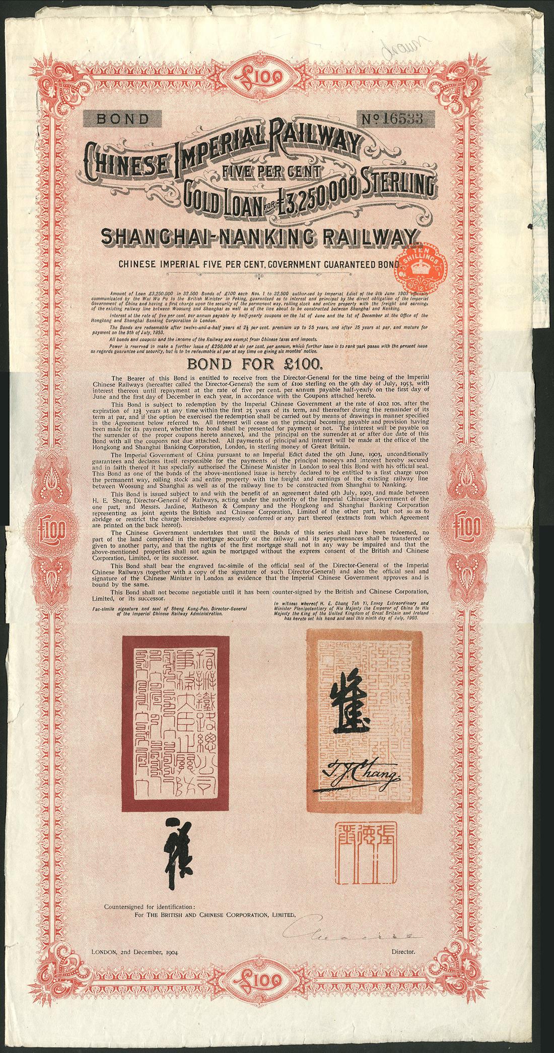 Chinese Imperial Railway 5% Gold Loan, Shanghai-Nanking Railway, a group of 50 bonds each for £100, first issue dated 1904, long narrow format, red pink and black, with coupons, generally fine to very fine. (50)