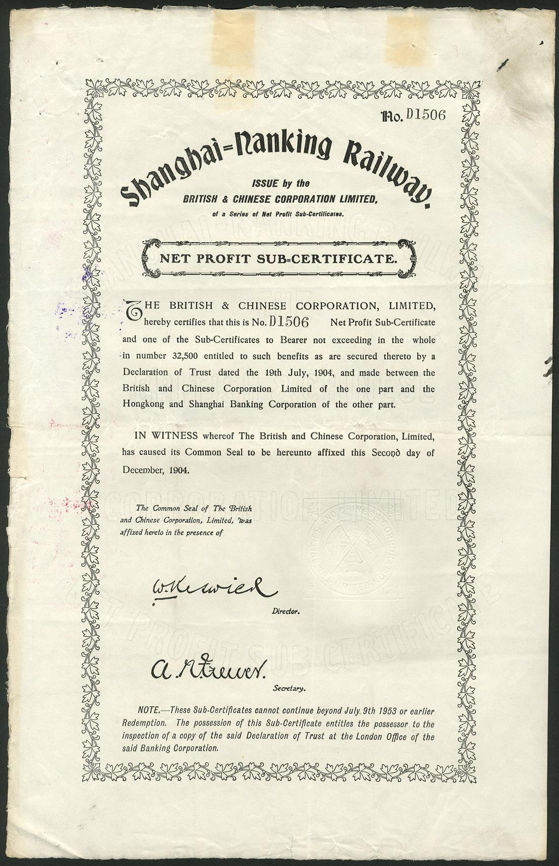 Shanghai Nanking Railway, Net Profit Sub-Certificate, a group of 113 certificates dated 1904 with facsmile signature of William Keswick, ornate border, black, mostly very fine and better. (113)