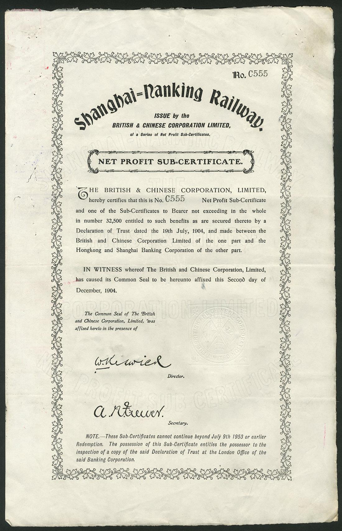 Shanghai Nanking Railway, Net Profit Sub-Certificate, a group of 185 certificates dated 1904 with facsmile signature of William Keswick, ornate border, black, mostly very fine and better. (185)