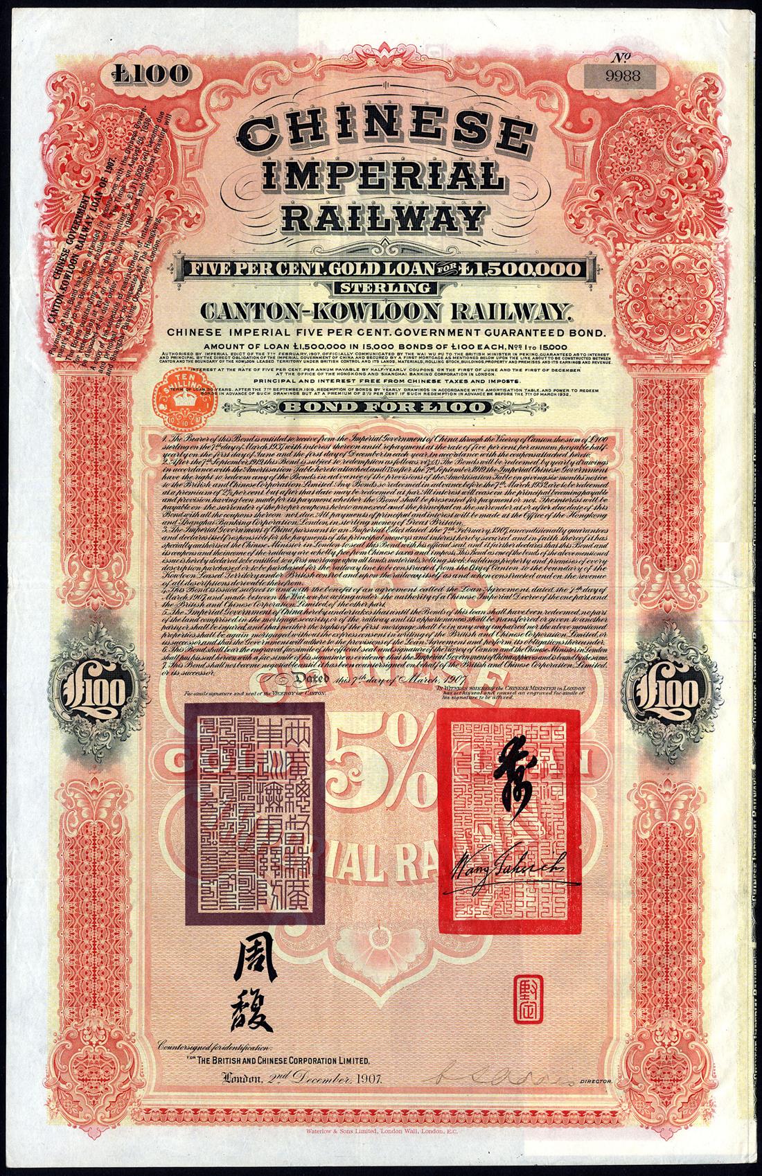1907 Canton Kowloon Railway 5% Loan, bond for £100, no.9988, large format, ornate border, red and black, printed by Waterlow, with coupons, centre fold, good very fine.
