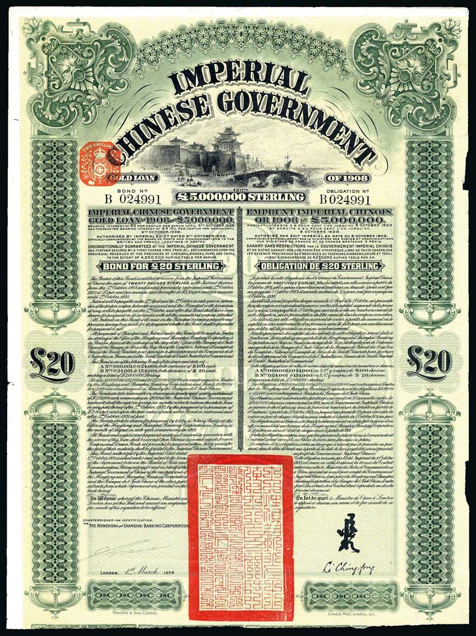 1908 5% Gold Loan (Peking-Hankow Railway), £20 bond, no.24991, issued by the Hong Kong and Shanghai Banking Corporation, vignette of city view, green and black, good very fine, rare, and good condition for this issue.