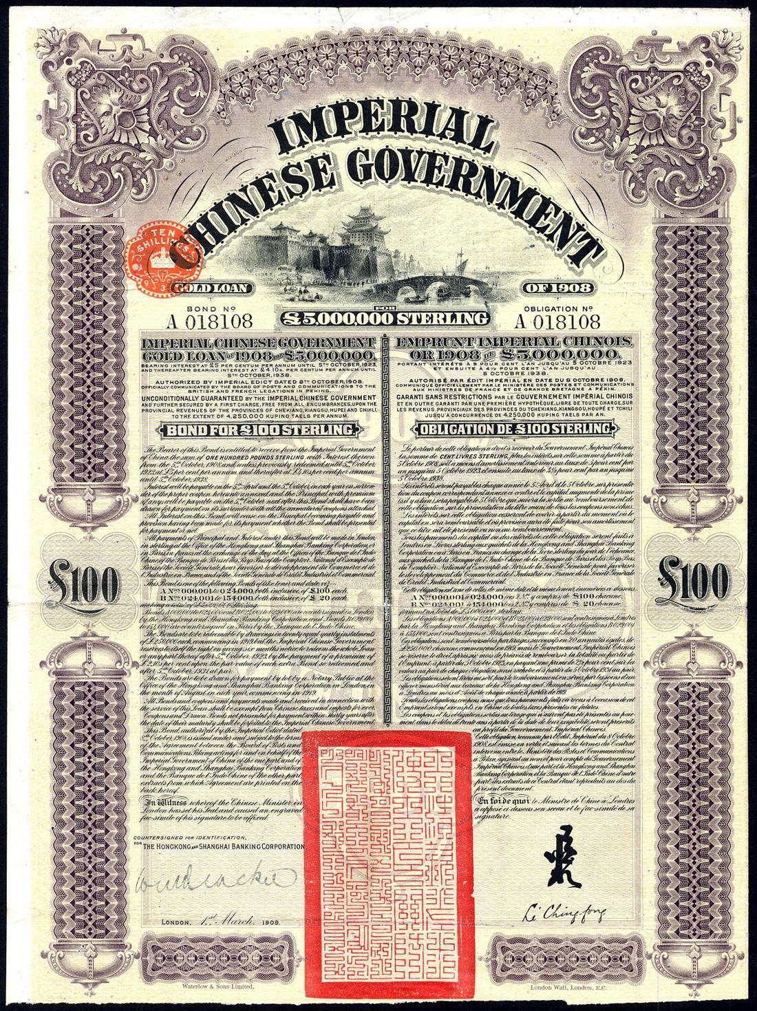 1908 5% Gold Loan (Peking-Hankow Railway), £100 bond, no.18108, issued by the Hong Kong and Shanghai Banking Corporation, vignette of city view, mauve and black, very fine, rare.
